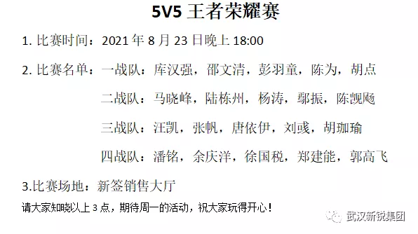 縱橫王者峽谷多年,是不是已經練就一身絕技?8月23日晚上六點,數商事業部在覃偉覃總和鄧武鄧總的帶領下,開展了一場王者榮耀5V5爭霸賽。8月21日上午,我們就發出了比賽的邀請通知,大家都踴躍報名,經過篩選,我們很快確定了參加人數并且分好了戰隊。8月21日下午,為了給大家充分地準備時間,我們也提前發出了比賽通知。